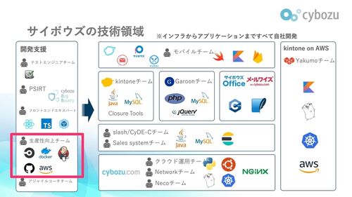 こんにちは、生産性向上チームです。今回は、私たち「生産性向上チーム」について紹介いたします。 生産性向上チームとは サイボウズの技術領域と生産性向上チームの立ち位置 生産性向上チームは主に、次のような業務を行っています。 チームを横断した開発…