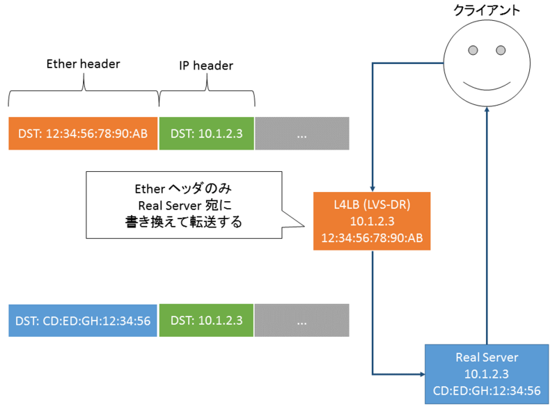 LVS-DR は、以下の図のようにクライアントからのパケットの Ether ヘッダアドレスのみを書き換え、 リアルサーバに転送する方式です。 この方法では、戻りパケットがロードバランサを経由しないので、ロードバランサに負荷が集中しないというメリットが有ります。